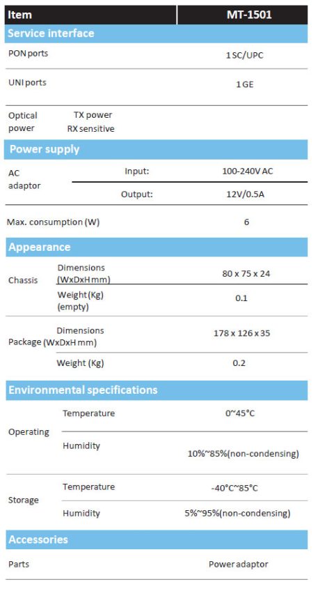 MT-1501 : FTTH/O ONT, 1 XPON port (SC/UPC), 1 GE TX port, supporting, plastic hull, external adaptor
